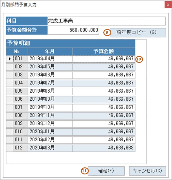 〔部門予算登録〕で入力した予算金額は、月別の部門別に予算金額を等分して登録します。(端数は最終月で調整)