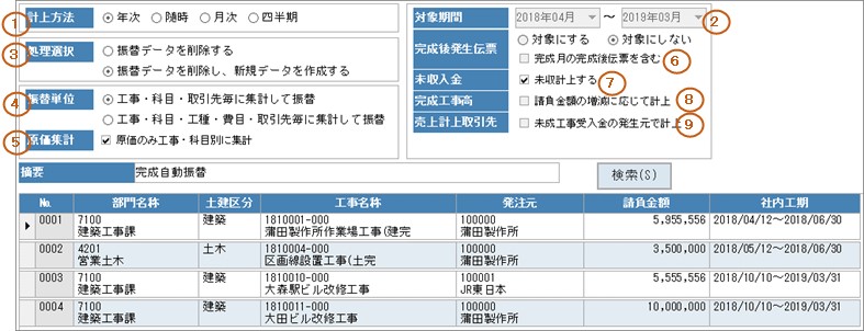 今期完成の完成基準工事を対象に、今までに発生した未成工事支出金、未成工事受入金および受注工事情報を基に、損益計上の会計仕訳を自動作成します。