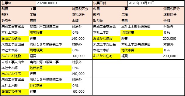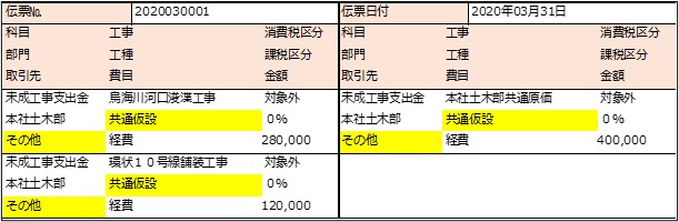 科目:未成工事支出金、工種:地代家賃、費目:経費