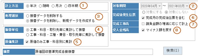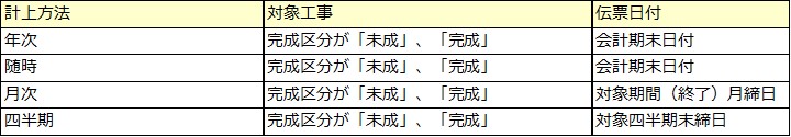 計上方法が「月次」、「四半期」で、且つ、完成後発生伝票が「対象にする」の場合、選択できます。