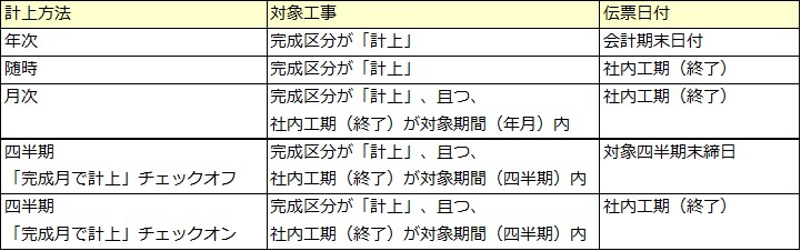 条件画面の計上方法と対象工事の〔受注工事登録〕の完成区分、社内工期(終了)によって、処理が