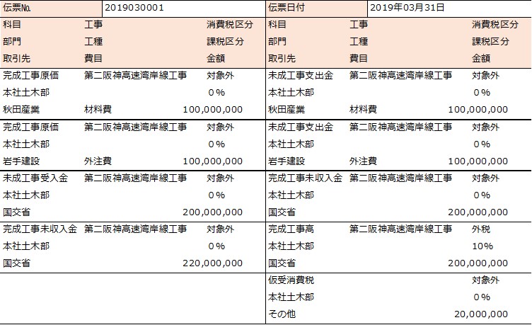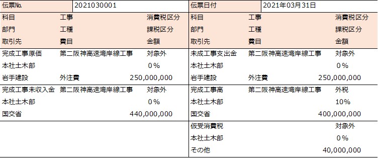 完成工事高の消費税(仮受消費税)は、完成工事高とセット(一対一)で計上されます。