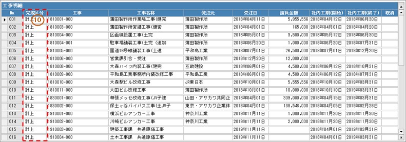10.工事明細の中に「計上」にしない工事が含まれている場合は、個別に「未成」もしくは「完成」に変更します。
