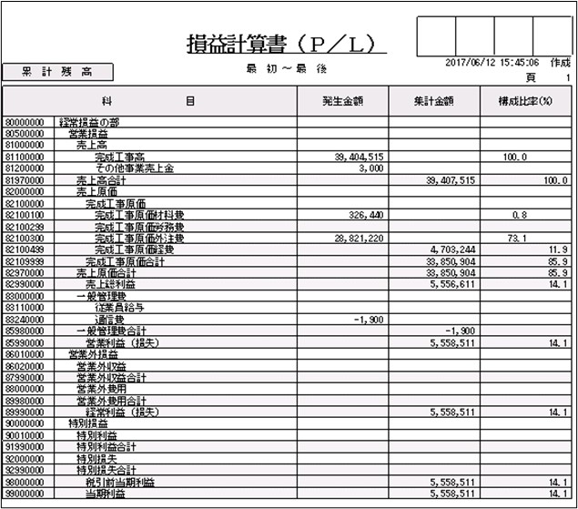累計残高:日付条件で指定した期間の発生高を発生科目と集計科目に分けて出力します。