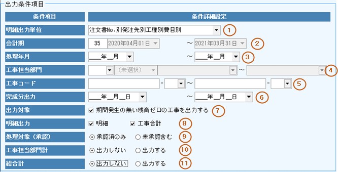 明細の表示単位を工種、費目、取引先、注文書No.の組み合わせの中から選択します。