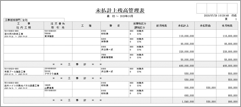 処理年月の範囲に対象データの発生が無い、もしくは対象科目の残高の無い工事を