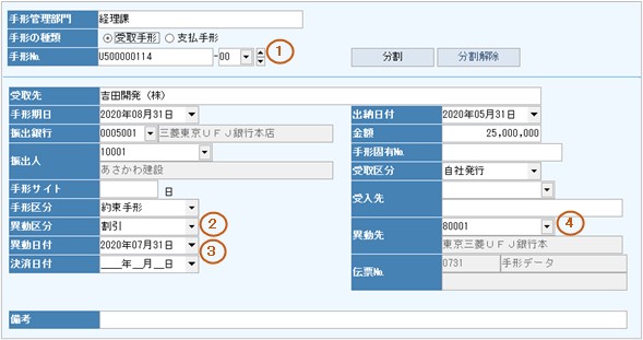 受取手形を手形割引するには、〔手形データ入力〕で異動情報を入力します。