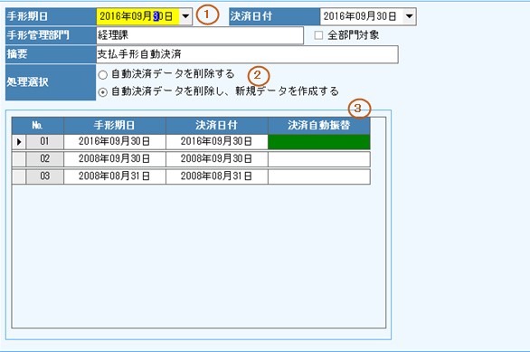 入力した手形期日が、実際の決済日と異なる場合(金融機関営業日など)は、決済日付を変更入力して