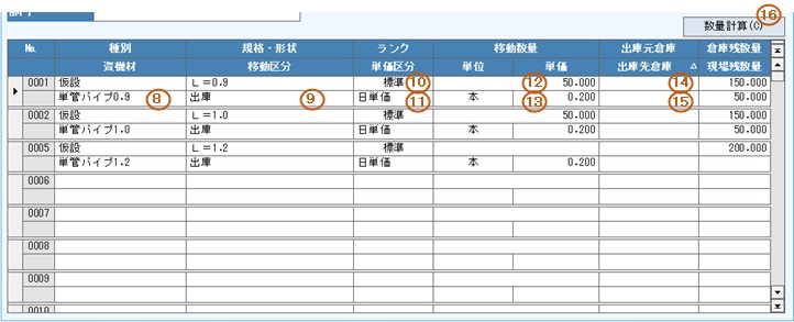 単価入力が必要な場合は、移動区分、ランク、単価区分により〔資機材登録〕で登録した単価が