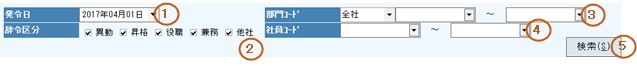 5.検索ボタンをクリックします。[ヘッダ]で指定した絞り込み条件から社員の異動情報を検索します。