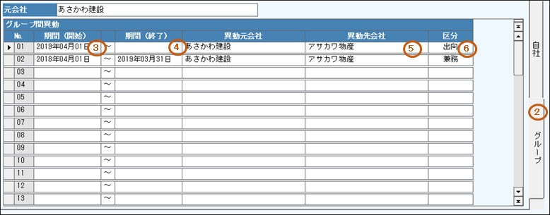 社員毎に、グループ会社間での異動、兼務、出向情報を登録します。