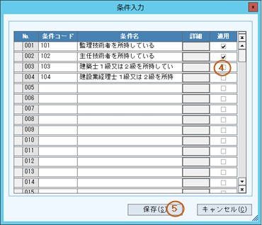 例)画面のように、「監理技術者を所持している」と「主任技術者を所持している」をチェックした場合、
