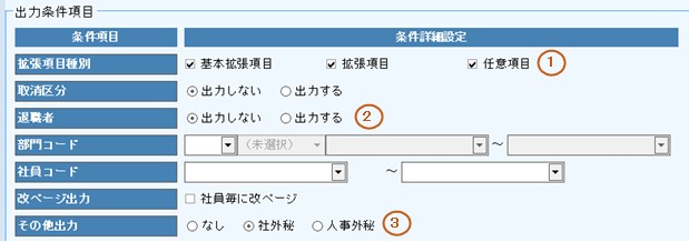 「任意項目」をチェックした場合、〔人事拡張項目登録〕の任意項目を出力します。