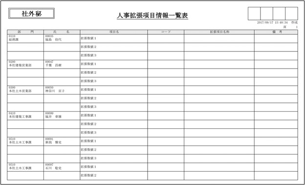 「拡張項目」をチェックした場合、〔人事拡張項目登録〕の拡張項目を出力します。