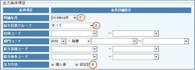 社員毎の給与明細を出力する場合、「個人毎」をチェックします。