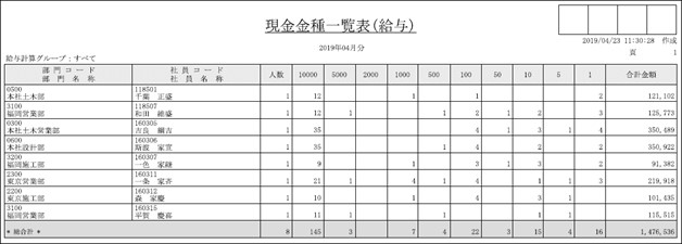 〔現金金種一覧表〕を出力し、現金支給額で必要な紙幣と硬貨の枚数を確認します。