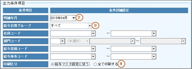 〔給与マスタ登録〕の給与明細印刷区分を登録している場合、「給与マスタ設定に従う」を選択します。