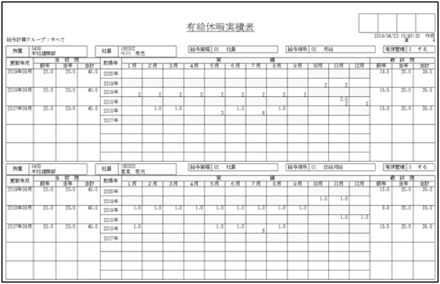 〔有給休暇実績表〕にて有給休暇の付与日数、取得日数、残日数の履歴を確認します。