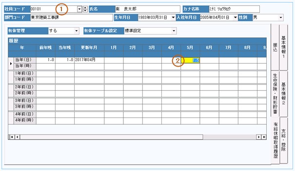 〔給与マスタ登録〕にて有給休暇の取得日数、残日数の修正ができます。