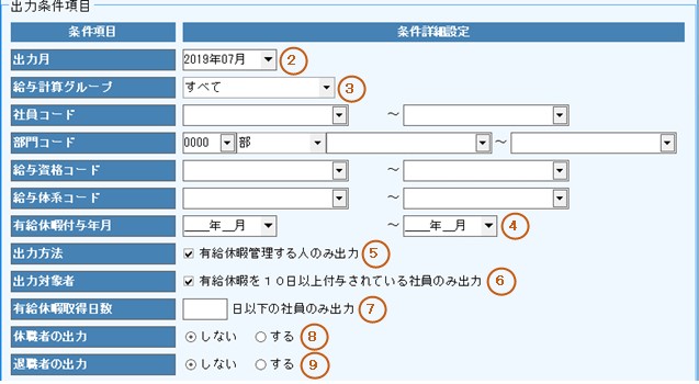 7.有給休暇取得日数が指定日数以内の社員を出力する場合に入力します。