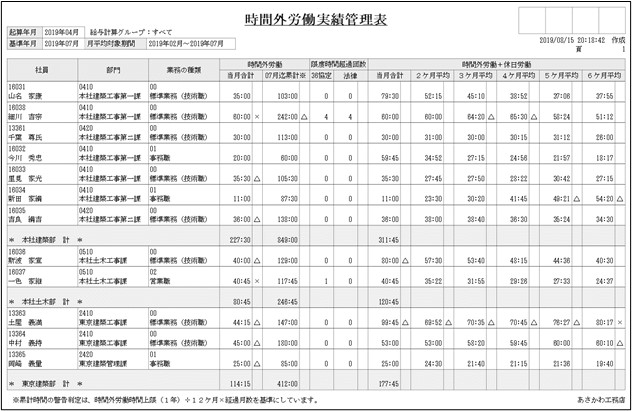 基準年月の時間外労働時間と休日労働時間の合計時間が入力された時間以上の社員を出力します。