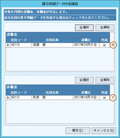 「表示する」を選択した場合、退職者、休職者に該当する社員が存在したとき、給与明細データ作成確認画面