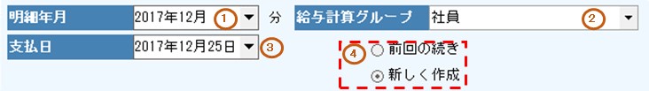 給与計算用の〔給与マスタ登録〕に更新する場合に、「前回の続き」を選択します。