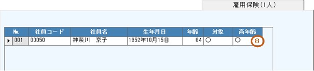 「○」は、4月に満64歳に達し、高年齢被保険者に該当する社員です。〔給与マスタ登録〕の雇用保険の