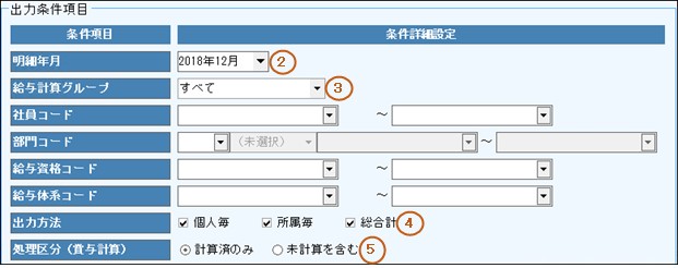 所属部門毎の小計を出力する場合、「所属毎」をチェックします。「所属毎」は、帳票種別「給与明細出力