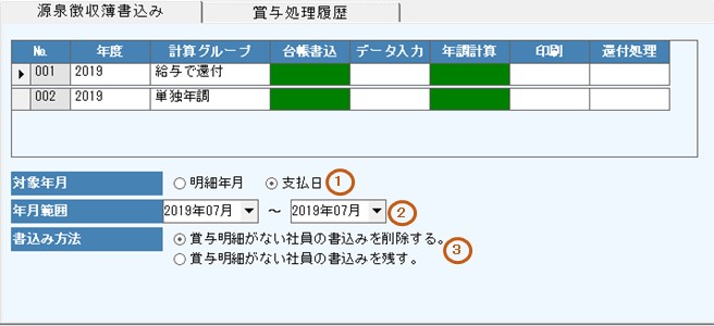 2年目以降は、「賞与明細がない社員の書込みを削除する。」を選択します。2年目以降で〔給与支給済額設定〕