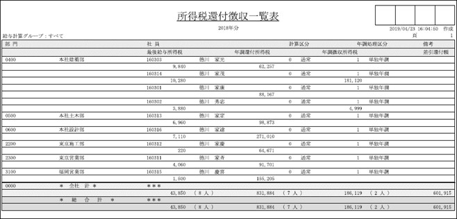 〔所得税還付徴収一覧表〕を出力し、年末調整の還付額、徴収額を確認します。
