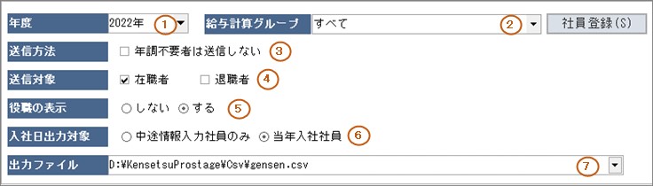 条件画面の「年度」と入社年が一致する社員の入社日を出力する場合、「当年入社社員」を選択します。