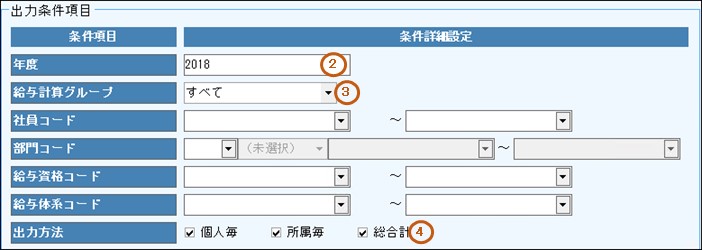 社員毎の給与明細を出力する場合、「個人毎」をチェックします。