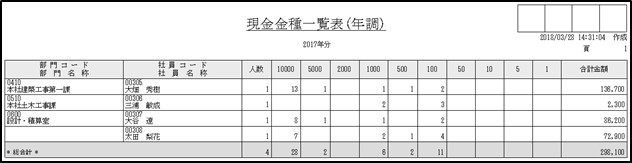 〔現金金種一覧表〕を出力し、社員の単独年調の還付にて、現金で必要な紙幣と硬貨の枚数を確認します。