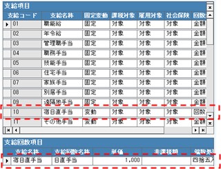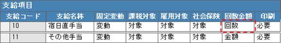 登録した回数から支給額を計算して給与明細に出力するために、支給項目に同じ項目を登録する