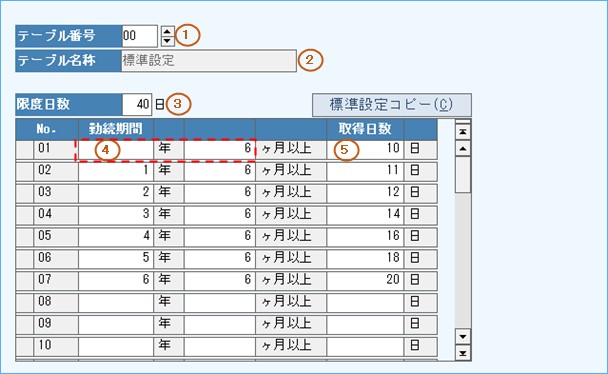 有休テーブルとして、有休保有限度日数と勤続年数に応じた有給休暇の取得日数を設定します。