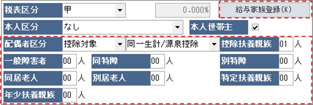 扶養親族情報(配偶者区分、控除扶養者親族、一般障害者、同特障(同居特別障害者)、別特障(特別障害者)、