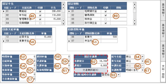 63.昇給(降給)の判定に交通費を含むかどうかを社員毎に設定する場合、選択します。