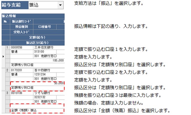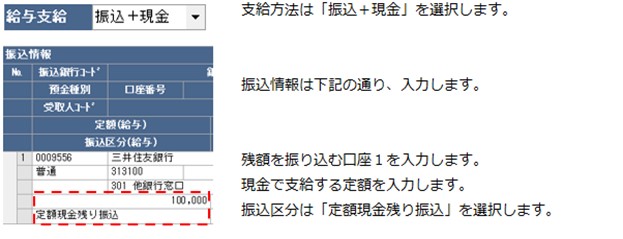 現金で定額支給し、残額振り込む場合の設定例) 現金定額10万円 口座1へ残額振り込む