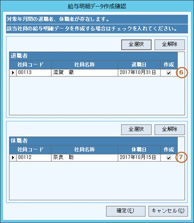 「表示する」を選択した場合、退職者、休職者に該当する社員が存在したとき、給与明細データ作成確認画