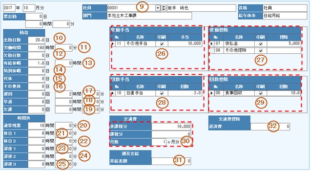 出勤簿や出勤票等より給与明細の勤怠と変動項目を登録します。