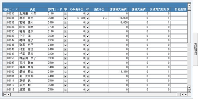 支給項目では、変動の支給項目、支給回数項目、交通費、昇級差額を入力します。
