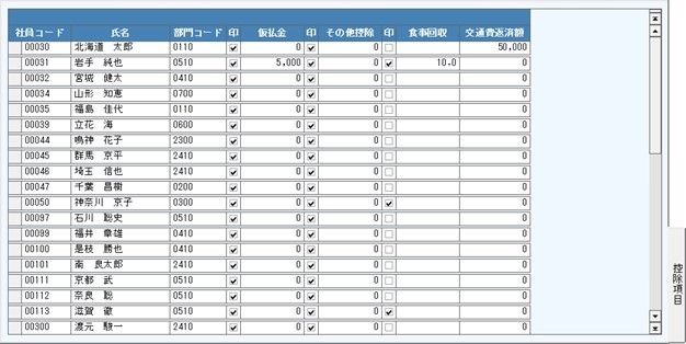 控除項目では、変動の控除項目、控除回数項目、交通費返済額を入力します。