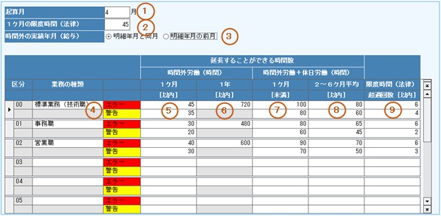 基準年月の1ケ月の時間外労働時間が、エラーの時間を超える場合、エラー判定となります。