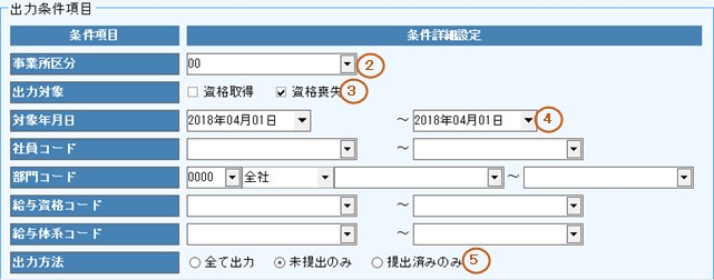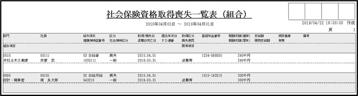 取得日/喪失日順社員順に出力します。健康保険組合の固有項目を出力します。