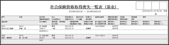 取得日/喪失日順社員順に出力します。厚生年金基金の固有項目を出力します。
