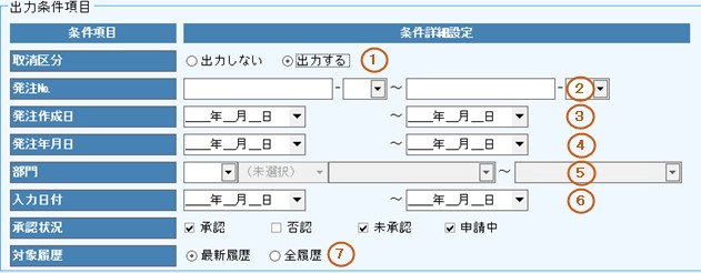 ※発注№を1件のみ指定して出力する場合は③④⑤⑥の条件入力は不要です。
