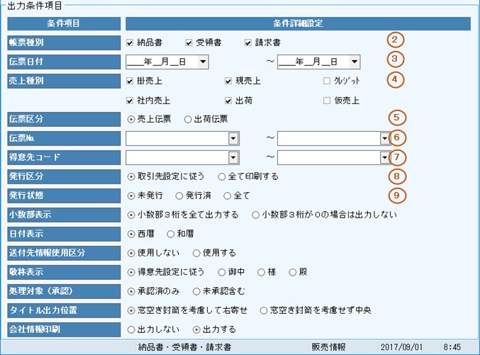 〔売上入力・出荷入力〕で登録した伝票№の範囲を入力します。