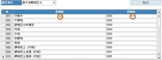 変換の対象になるのは、他社会計連携設定画面の出力項目設定の一覧の「設定項目」の