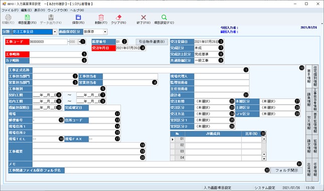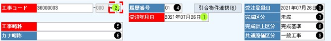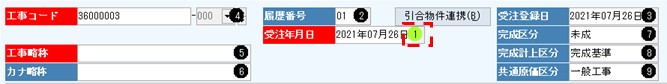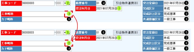 例)受注年月日、工事コードの順に移動する 受注年月日をクリック(1番目の項目) 工事コードをクリック(2番目の項目)